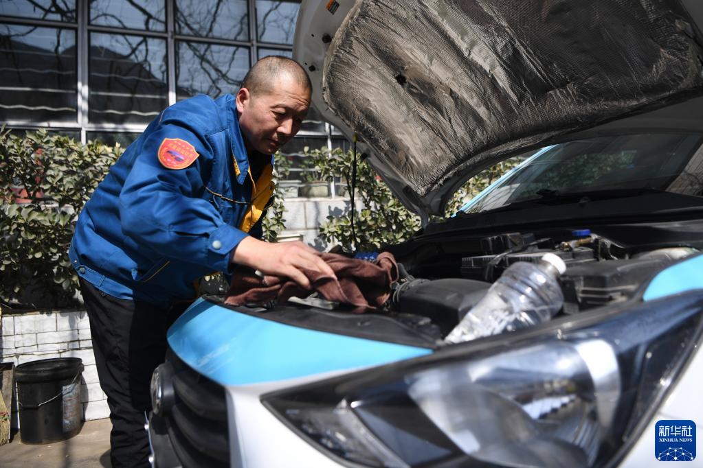 強漢紅在檢查、擦拭車輛(3月1日攝)。