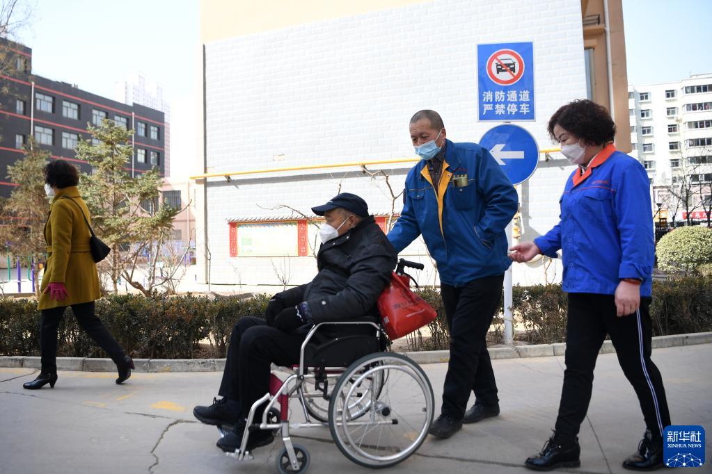 強漢紅(右二)和同事胡建萍(右一)一起接送一位行動不便的老人去醫院就醫(3月1日攝)。