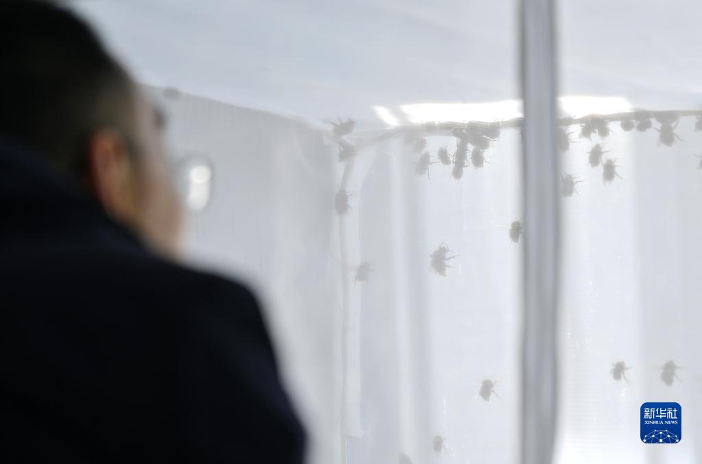 在中農熊蜂繁育基地,工作人員查看交配籠中的蜂王(3月1日攝)。