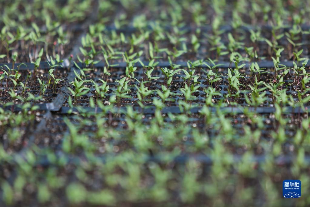 3月1日在和田縣塔瓦庫勒鄉辣椒產業園育苗大棚拍攝的辣椒苗。