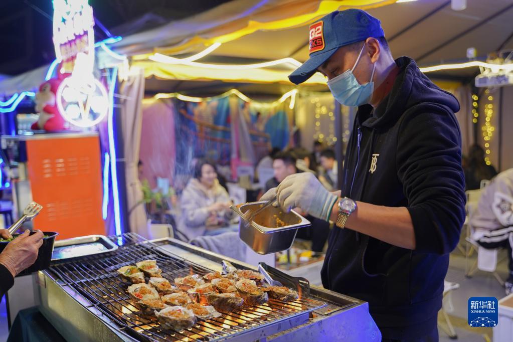 在四川省成都市錦江區三色路夜市,攤主在制作小吃(2月28日攝)。