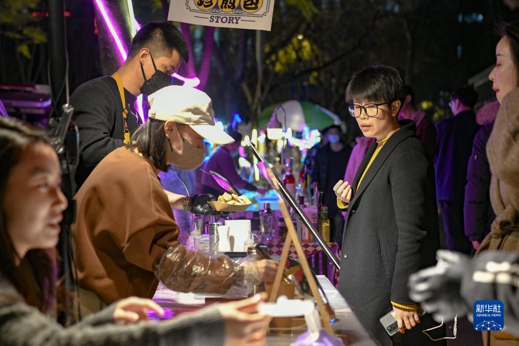 在四川省成都市錦江區三色路夜市,市民在購買小吃(2月28日攝)。