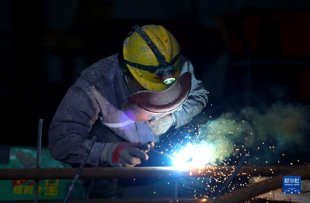 3月1日,在沈白高鐵遼寧段一處鋼筋加工廠,中鐵十九局施工人員進(jìn)行焊接作業(yè)。