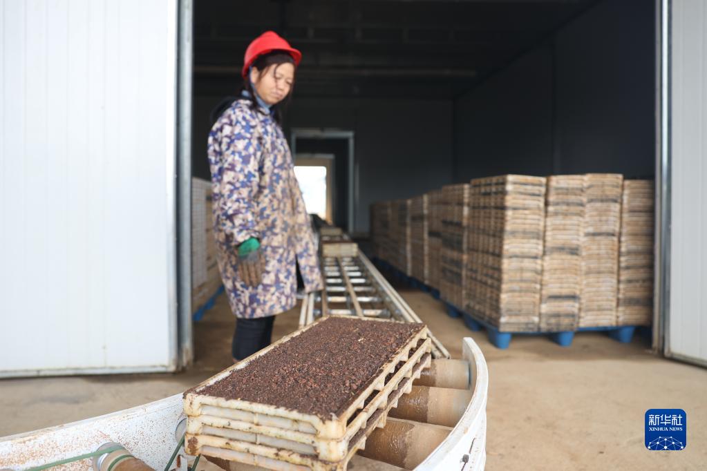 3月2日,待催芽的秧盤由帶式輸送機送入智能密室催芽。