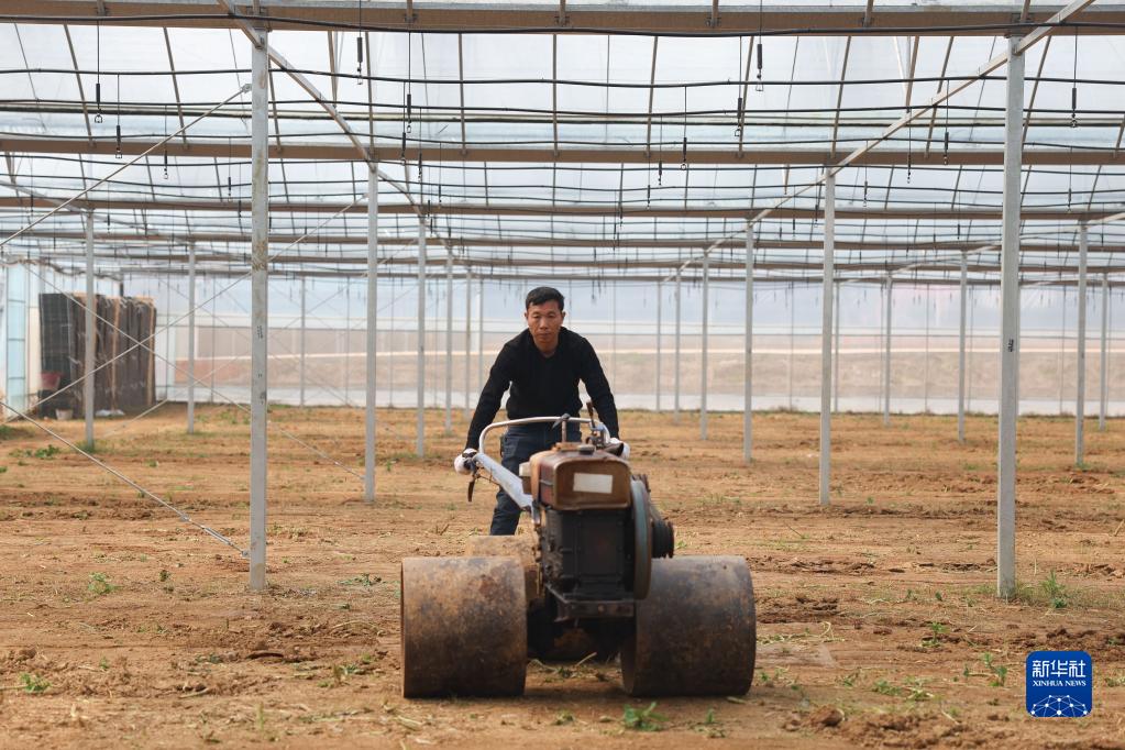 3月2日,農(nóng)民在智能溫控大棚中平整土地。