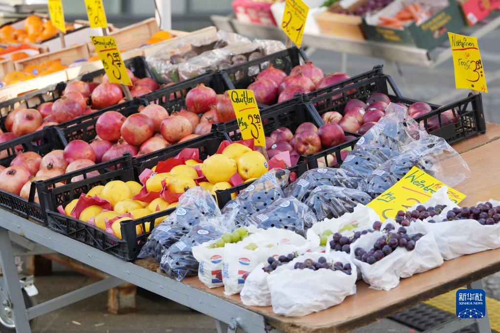 這是3月2日在德國(guó)柏林拍攝的一處水果攤。