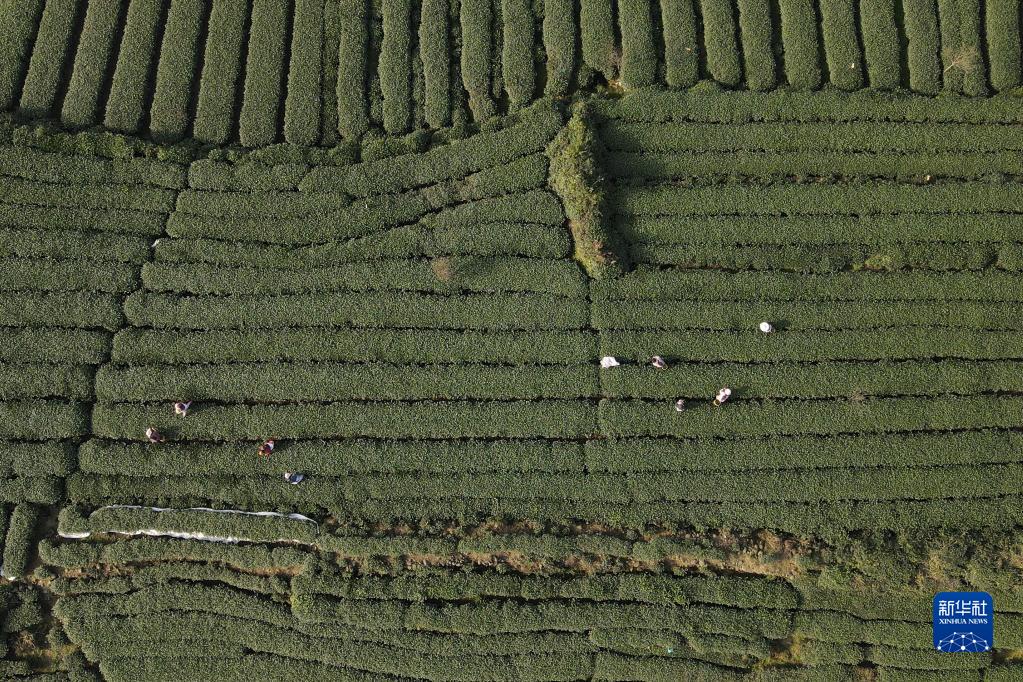 3月1日,在雅安市名山區(qū)騎龍場萬畝觀光生態(tài)茶園內(nèi),茶農(nóng)在采摘春茶(無人機(jī)照片)。