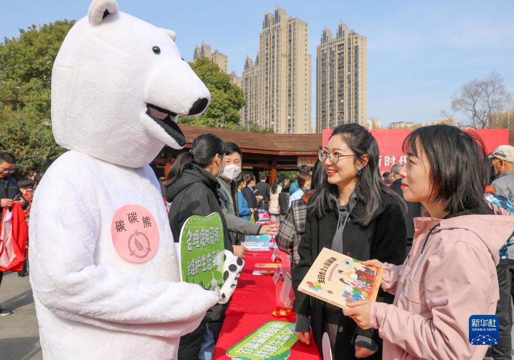 3月3日,穿著卡通服裝的合肥市包河區(qū)濱湖世紀(jì)社區(qū)志愿者向居民講解環(huán)保知識(shí)。