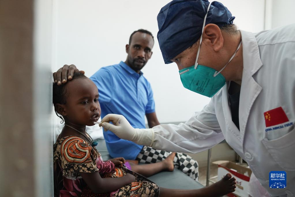 2月28日,在吉布提首都吉布提市貝爾蒂耶醫院,中國第21批援吉布提醫療隊醫生周乃忠為一名兒童患者診治。