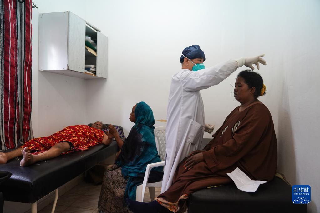 2月28日,在吉布提首都吉布提市貝爾蒂耶醫院,中國第21批援吉布提醫療隊醫生周乃忠為當地患者進行針灸治療。