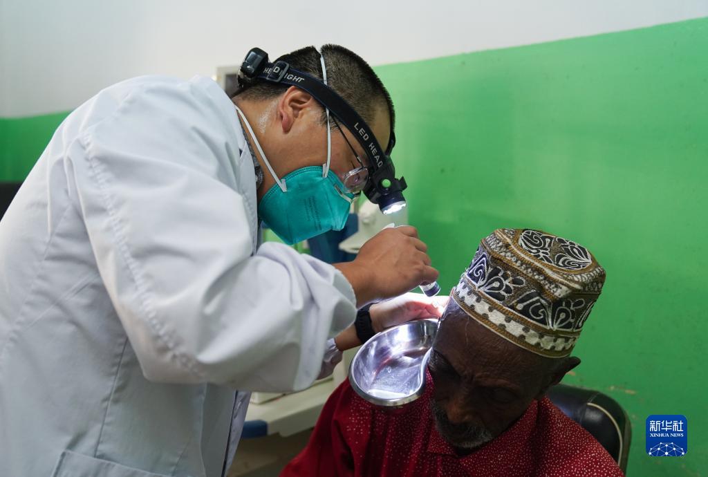 3月1日,在吉布提首都吉布提市貝爾蒂耶醫院,中國第21批援吉布提醫療隊醫生王旭峰為當地患者診治。