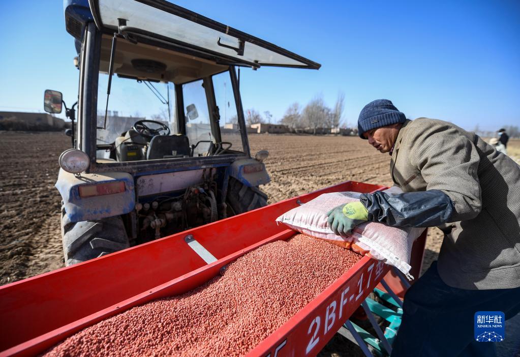 3月3日,在寧夏銀川市賀蘭縣立崗鎮銀星村,農戶向農機添加小麥種子。