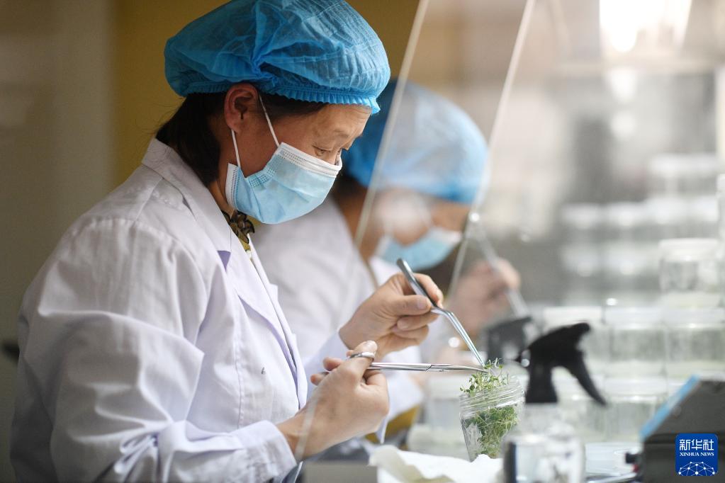 工作人員在寧夏西吉縣恒豐馬鈴薯種薯脫毒繁育中心進行馬鈴薯脫毒苗切段繁育(3月2日攝)。