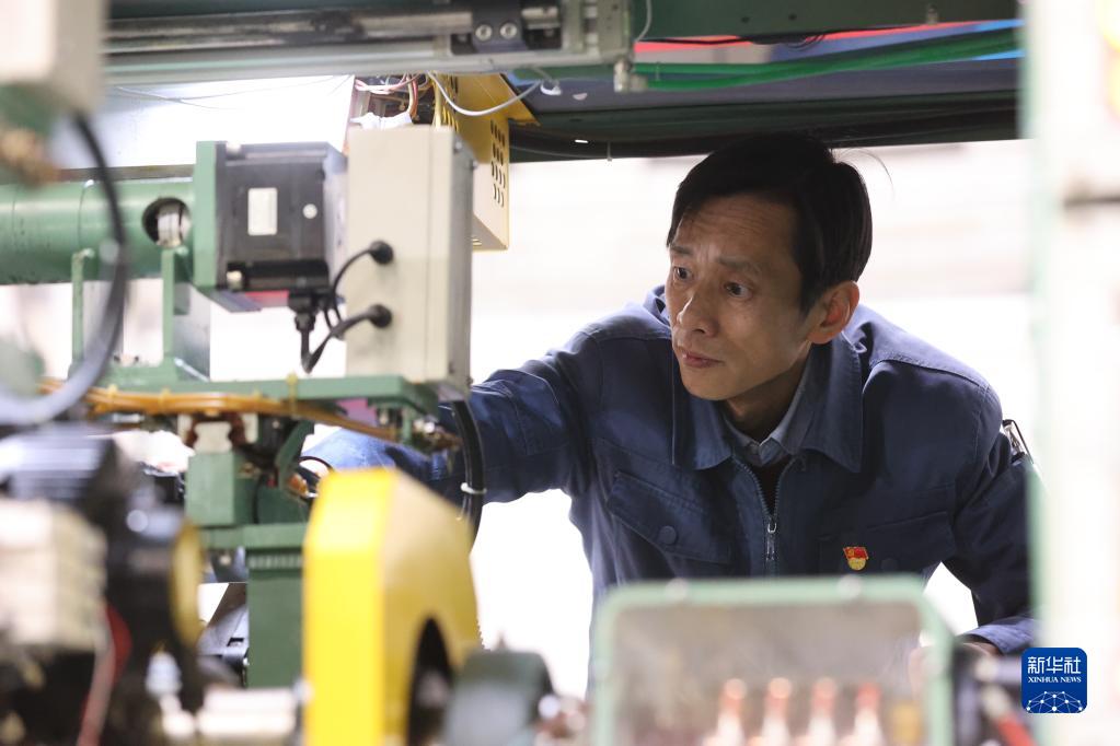 2月17日,全國人大代表、山東省泰安市泰山玻璃纖維有限公司設備動力部部長溫廣勇在進行拉絲機設備升級的功能驗證。