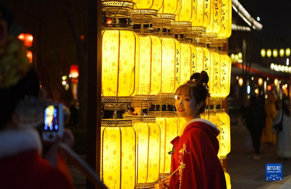 游客在洛陽市洛邑古城內游玩拍照(2月28日攝)。