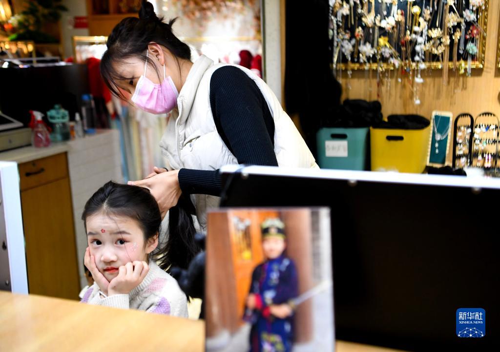 在洛陽(yáng)市洛邑古城一家傳統(tǒng)服飾店內(nèi),工作人員給小游客梳妝(2月28日攝)。