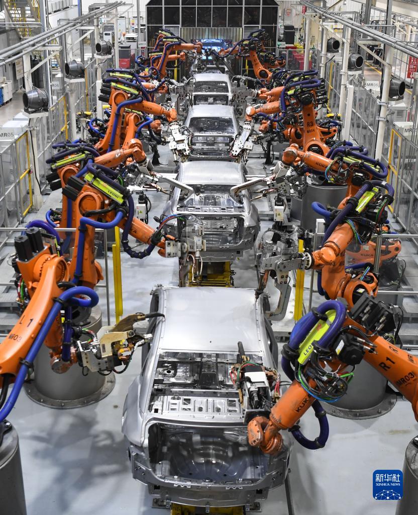 在廣州市番禺區的廣汽埃安新能源汽車股份有限公司焊裝車間,機器人手臂在焊接作業中(2月24日攝)。