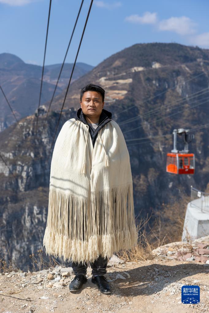 這是2月14日拍攝的鄭望春,其背后就是古路村村民出行所乘坐的懸崖索道纜車。