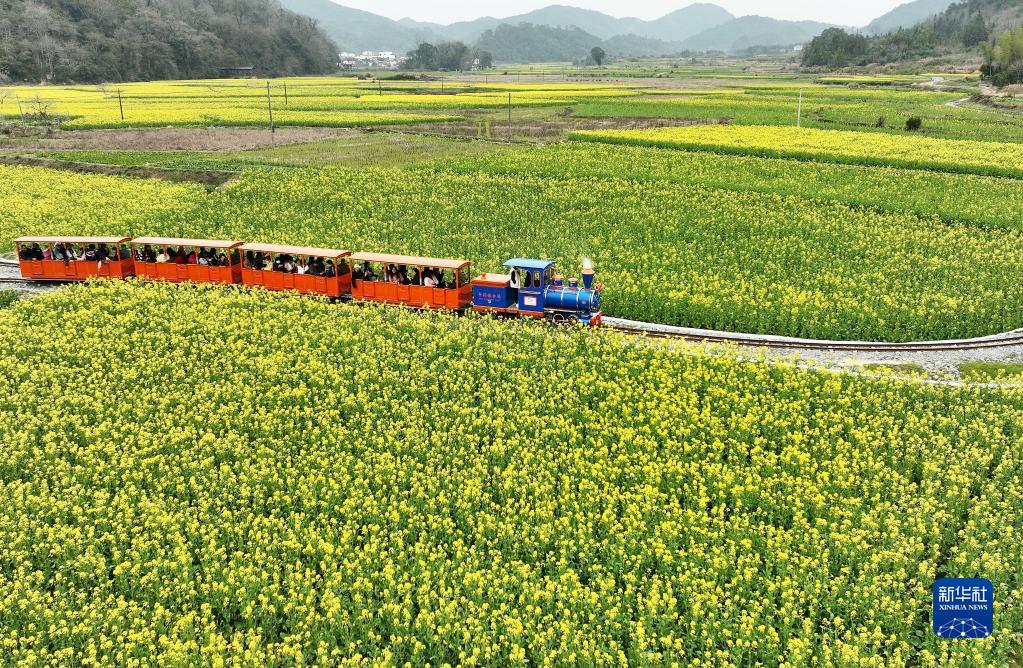 游客在江西省婺源縣嚴田景區乘坐“小火車”觀賞花海(3月3日攝,無人機照片)。