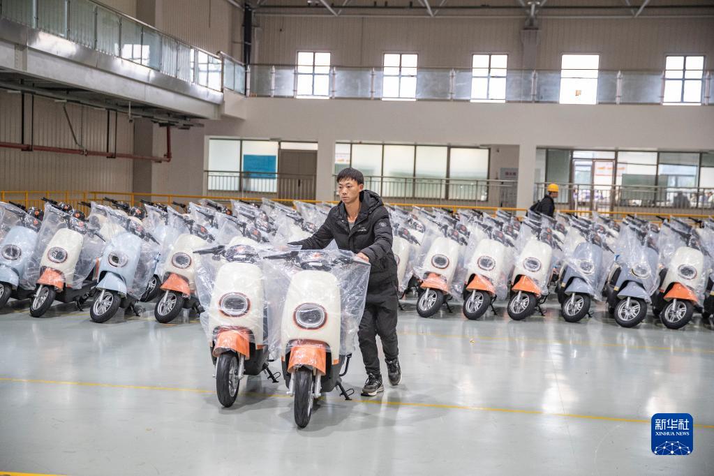 2月22日,在雅迪科技集團重慶永川電動車生產基地,員工將成品電動車推至智能化運輸線上運往倉庫。