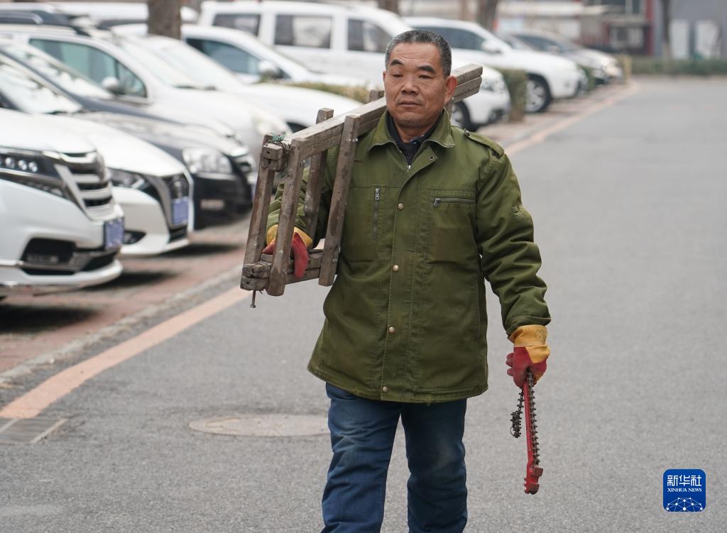 殷萬江行走在北京市順義區旺泉街道宏城花園社區,準備對社區居民樓內的管道進行維護(2月23日攝)。