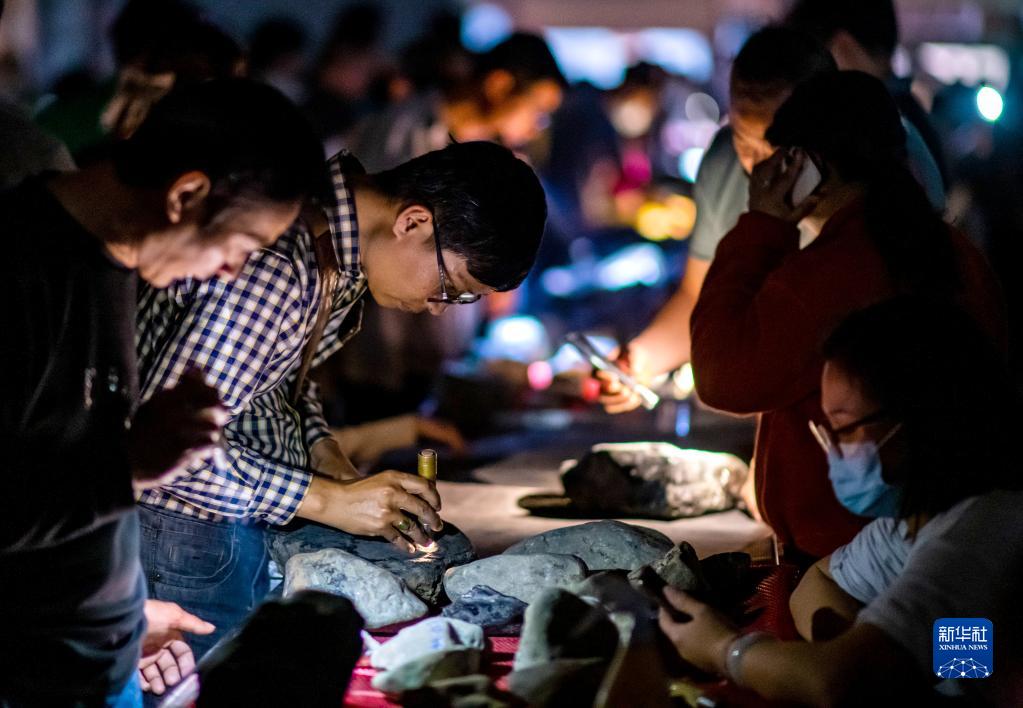 客商在云南省瑞麗市一處夜間珠寶銷售市場挑選翡翠原石(3月3日攝)。
