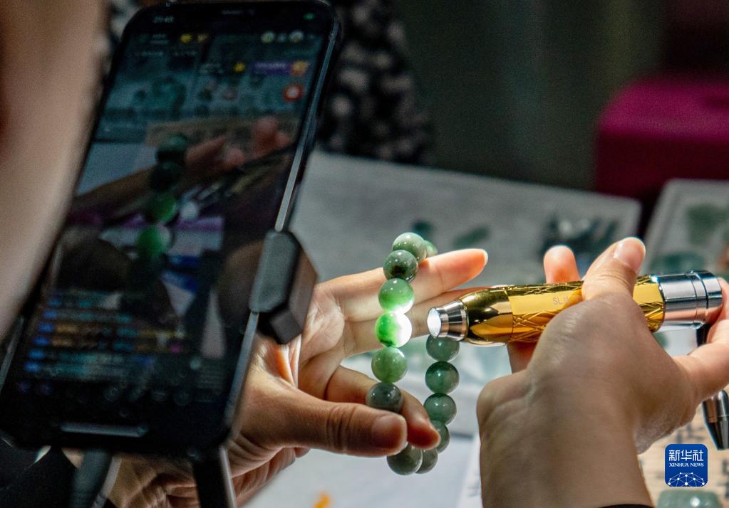 電商在云南省瑞麗市一處珠寶直播市場進行直播銷售(3月3日攝)。