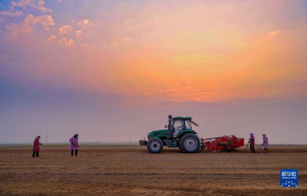 2月28日拍攝的陜西省渭南市合陽縣和家莊鎮故池村中藥材種植基地機械收獲場景。