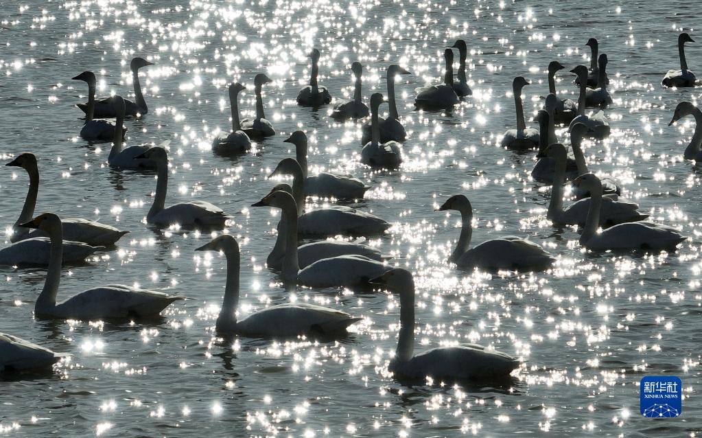 2月25日,天鵝在河北省唐山市曹妃甸濕地水面上游弋。