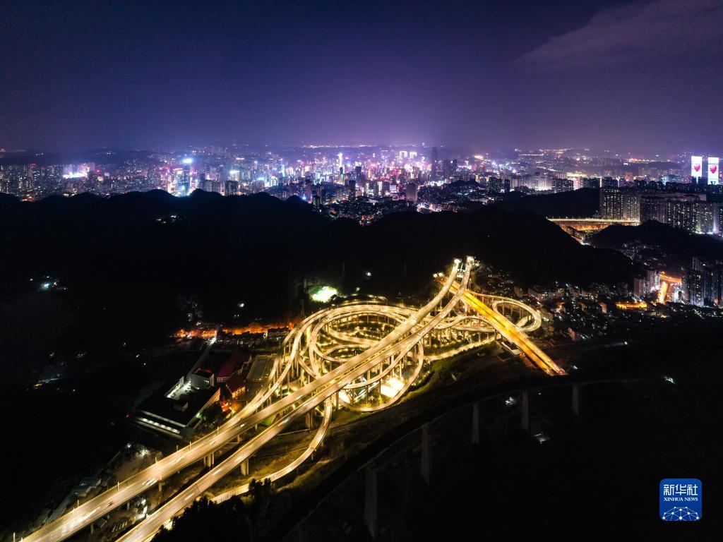 2月25日拍攝的貴陽黔春立交橋夜景(無人機照片)。位于貴州省貴陽市云巖區(qū)北京西路上的黔春立交橋,共有5層立體交叉、11條匝道、8個出入口,最大垂直落差為55米。