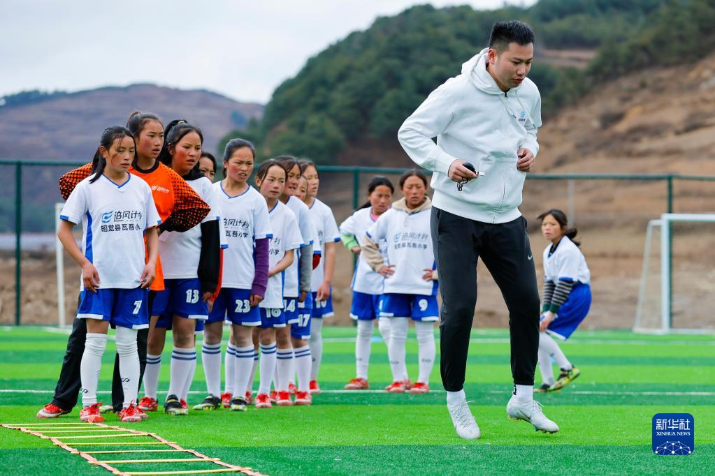 圖為在“玫瑰夢(mèng)想球場(chǎng)”上,瓦吾小學(xué)的女足隊(duì)員們?cè)诮叹毑車?guó)棟(前)的帶領(lǐng)下訓(xùn)練(2023年3月3日攝)。
