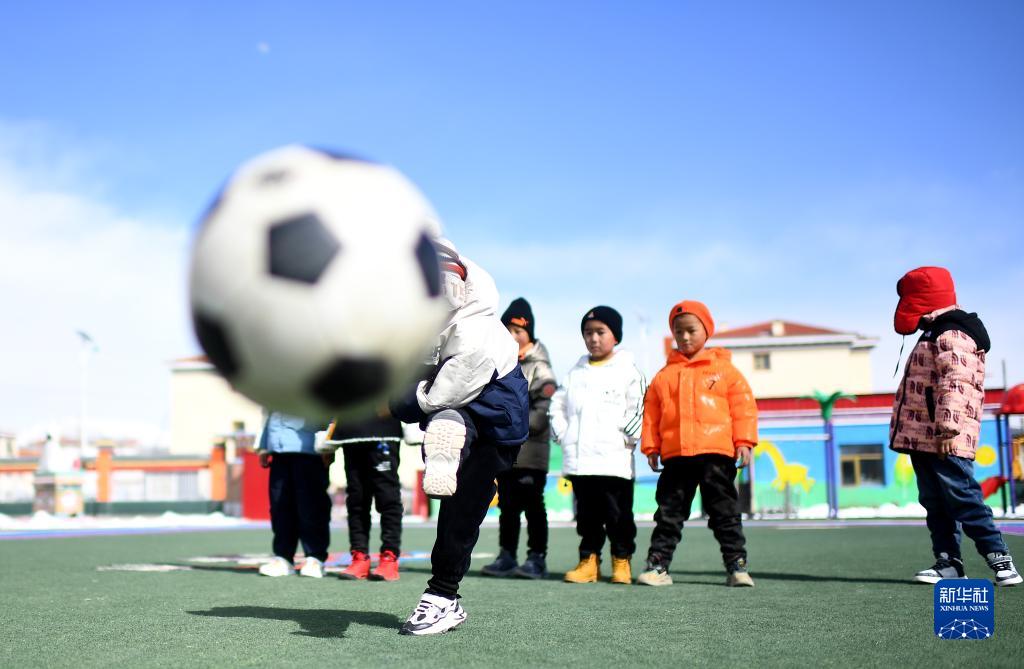 3月1日,在玉樹州治多縣,城南幼兒園小朋友桑周尼瑪(前)在練習射門。