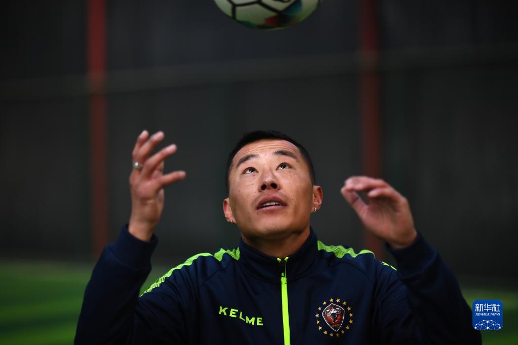3月2日,在玉樹州玉樹市一處室內(nèi)球場,玉樹康巴野牦牛足球隊隊員、2018-2019年“玉樹足球先生”尼瑪才仁在場邊熱身。