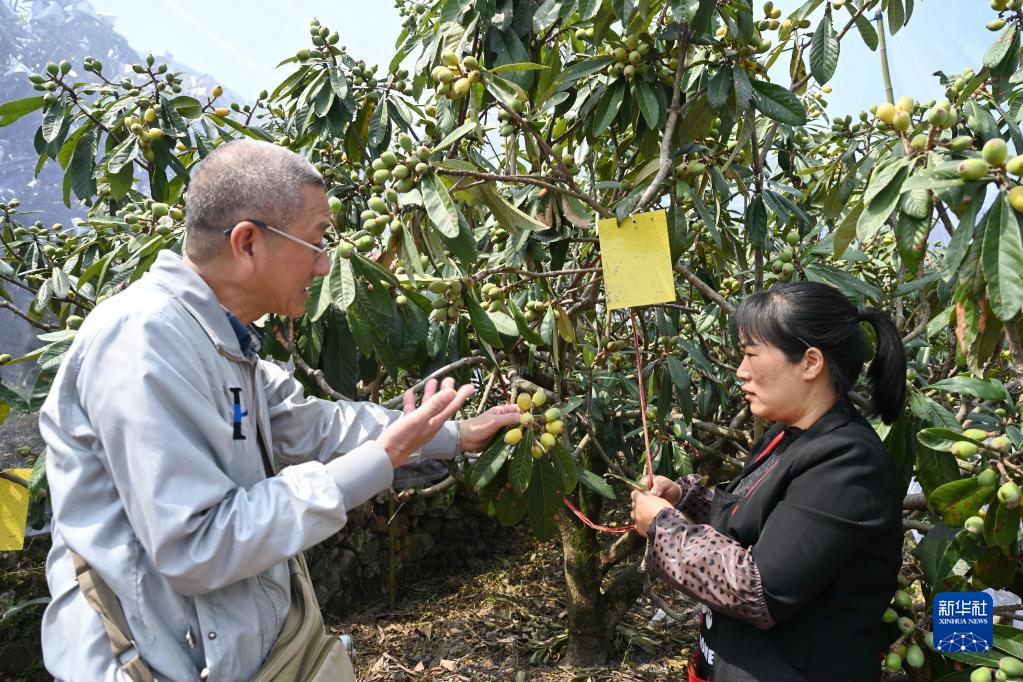 3月3日,云霄縣農業農村局高級農藝師陳天佑(左)在吳素華的枇杷種植園進行技術指導。