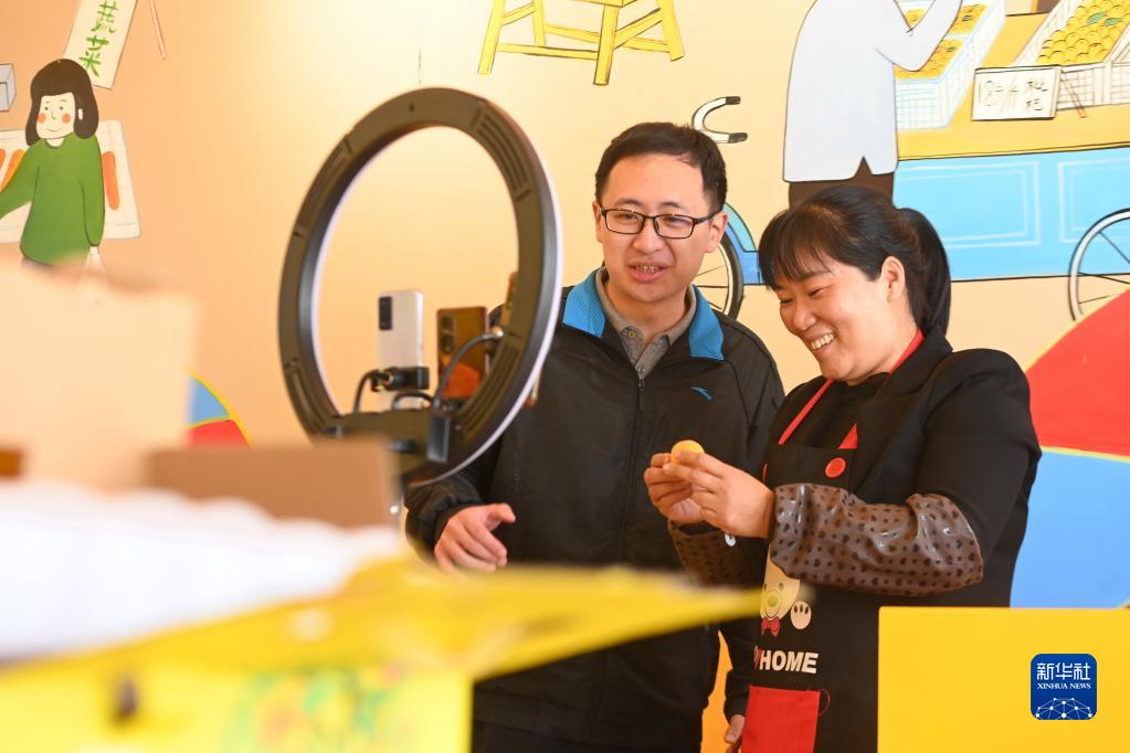 3月3日,吳素華(右)同棪樹村的駐村干部一起直播帶貨。