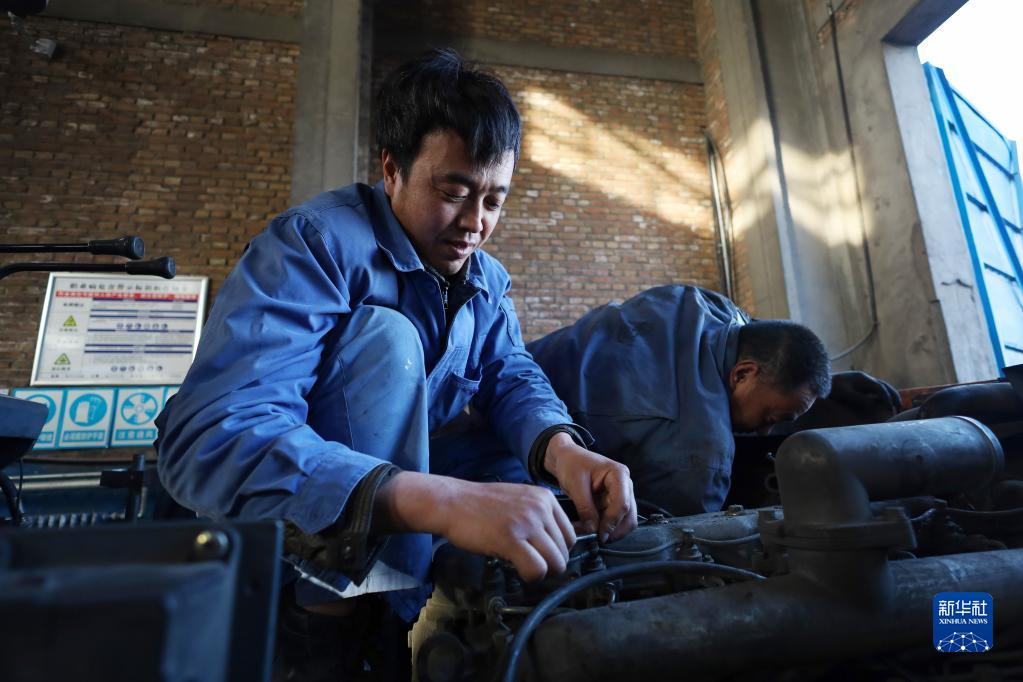 3月4日,劉富強(qiáng)(左)和同事在公司汽車維修車間維修車輛。