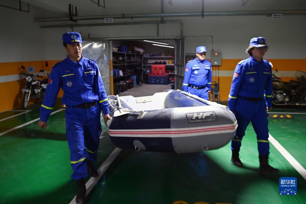 3月4日,劉富強(左一)在嘉峪關藍天救援隊裝備庫搬運救援裝備沖鋒舟。