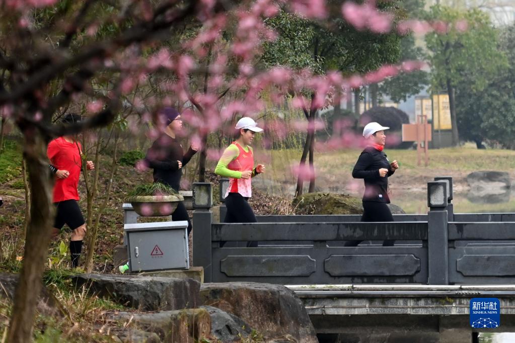 3月1日,跑步愛好者在浙江省寧波市奉化區仁湖公園晨跑。