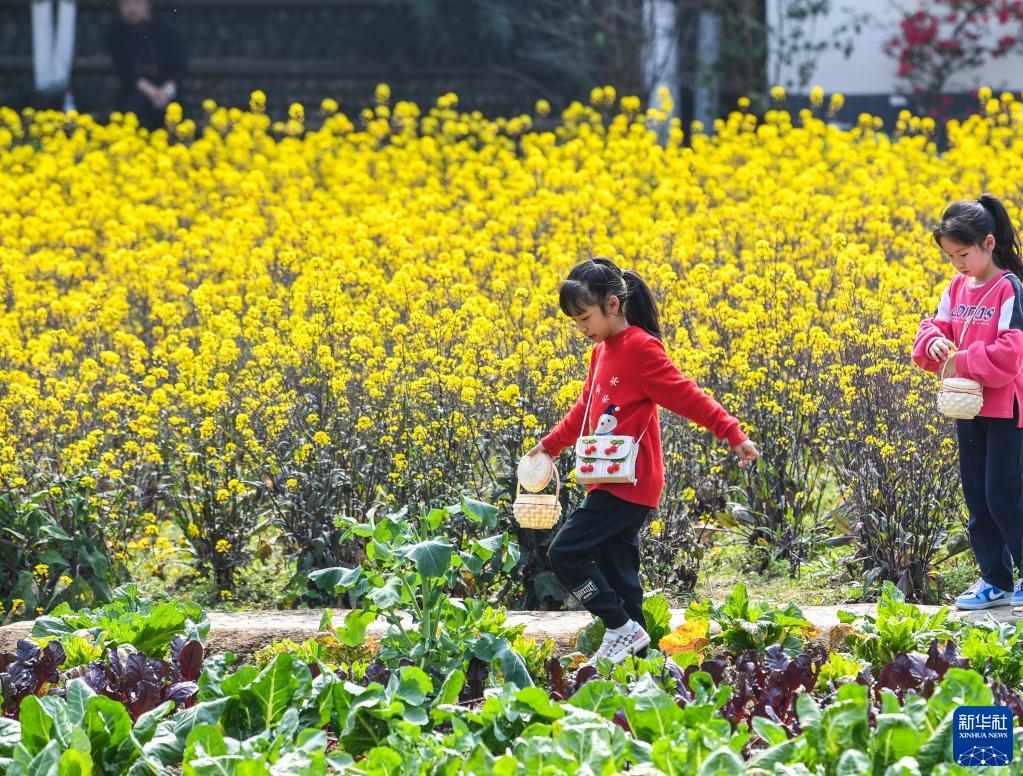 3月5日,在四川省崇州市道明鎮,小朋友在油菜花田中玩耍。