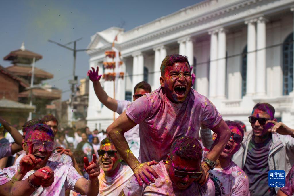 3月6日,人們在尼泊爾加德滿都參加灑紅節慶祝活動。