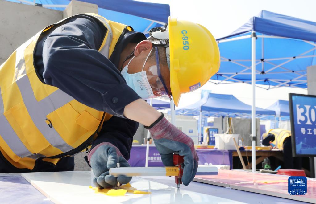 3月6日,參賽選手在進行裝飾裝修工(鑲貼工)項目比賽。