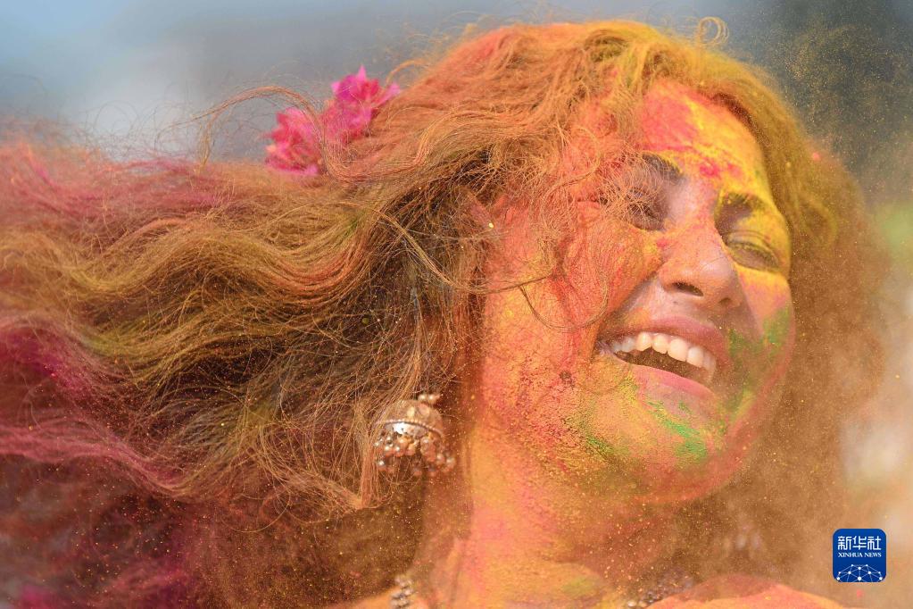 3月6日,一名女子在印度阿加爾塔拉參加灑紅節(jié)慶祝活動。