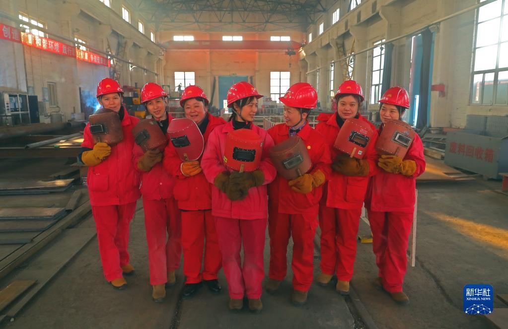 這是女子焊工班成員駱建寧、江遠芳、謝金穎、王喜蓮、李文靜、楊景愛、余容(從左到右)在焊接車間合影(2月27日攝)。