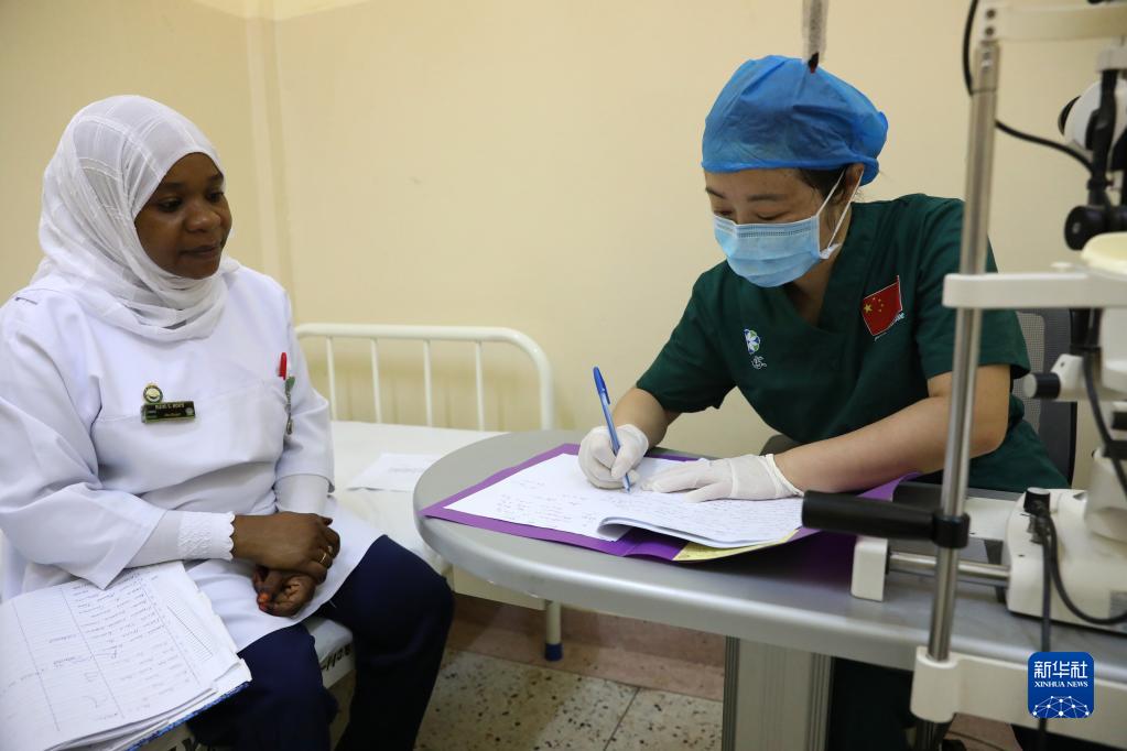 2月23日,在坦桑尼亞桑給巴爾島納茲莫加醫院,董莉莉(右)做術前檢查準備。