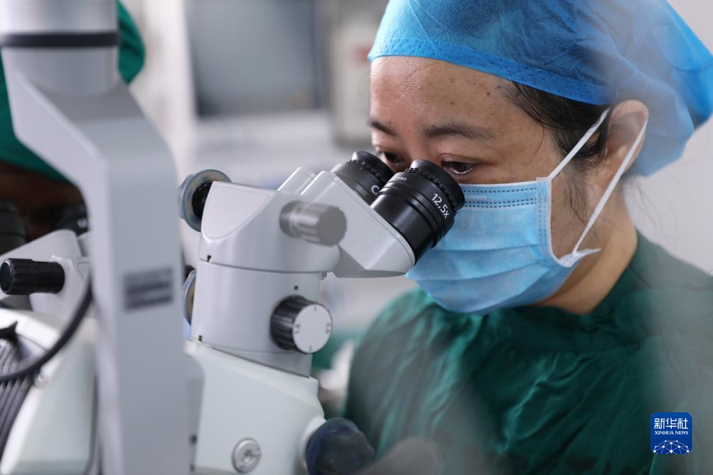 2月23日,在坦桑尼亞桑給巴爾島納茲莫加醫院,董莉莉為穆欣做白內障超聲乳化摘除手術。
