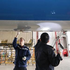 3月7日,在海口美蘭國際機場,南航機務人員對“消博號”彩繪飛機進行深度檢查。