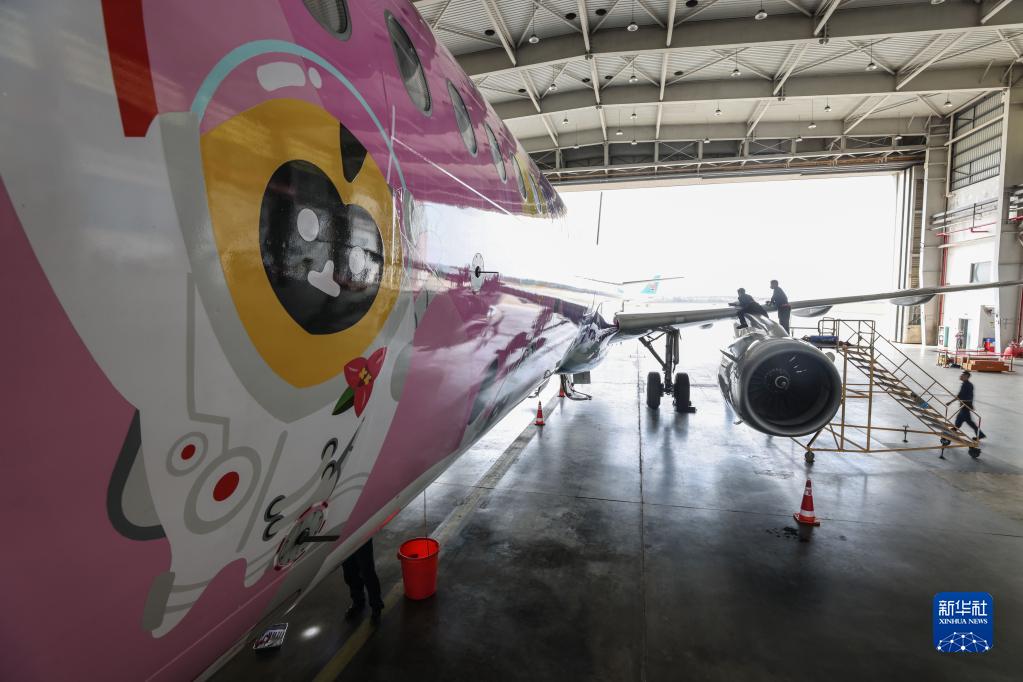 3月7日,在海口美蘭國(guó)際機(jī)場(chǎng),南航機(jī)務(wù)人員對(duì)“消博號(hào)”彩繪飛機(jī)進(jìn)行深度檢查。