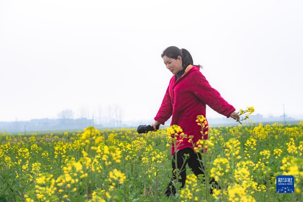 3月1日,女飛手吳玲走在油菜田間。