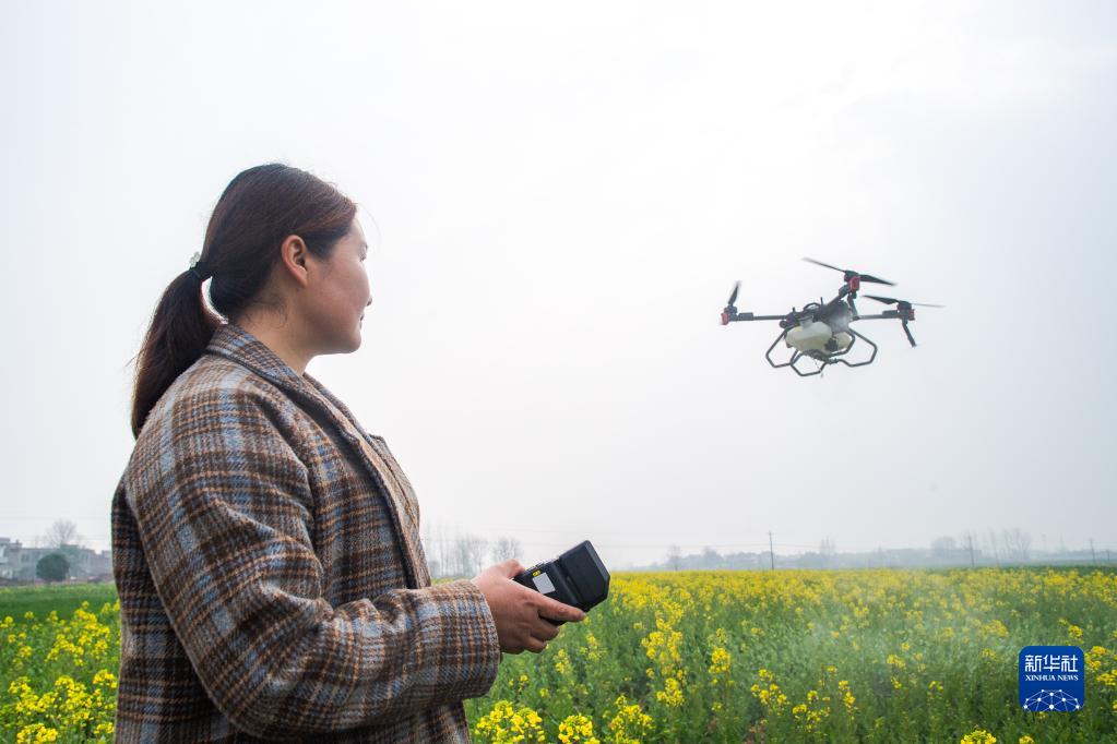3月1日,在湖北省天門市黃潭鎮一處油菜田,女飛手陳碧容利用植保無人機進行噴藥作業。