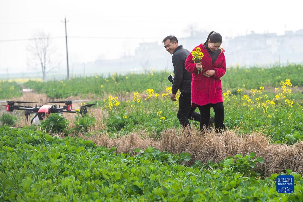 3月1日,女飛手吳玲(右)與丈夫走在油菜田間,準(zhǔn)備進(jìn)行噴藥作業(yè)。
